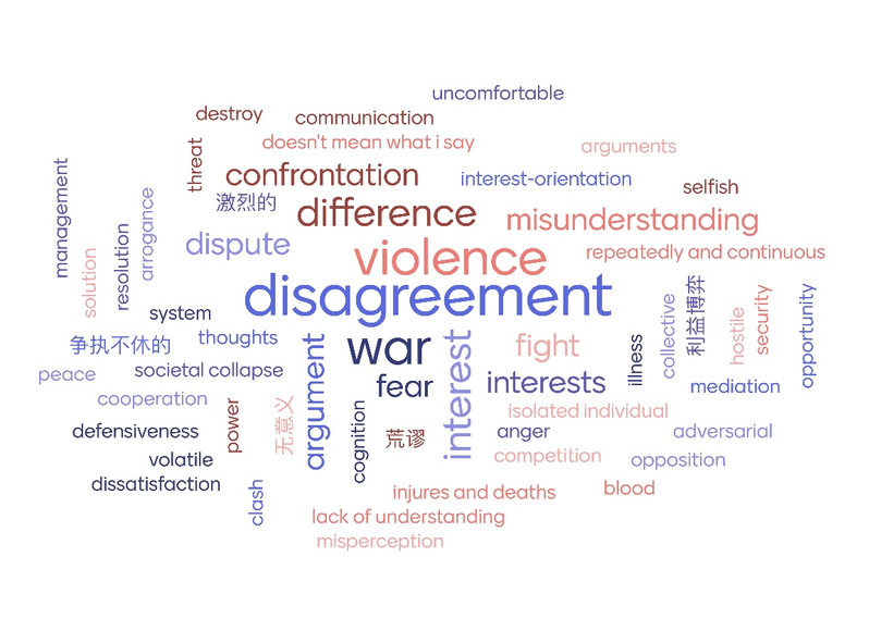 如果用三个词描述你对‘冲突’的第一印象,会是什么?”随着主持人的提问,研讨会进入趣味与深度兼具的“词语联想”环节。除了“分歧”“暴力”“战争”等传统认知,现场生成的词频示意图清晰显示 “机遇”“协作”“意义”等具有正面导向的词汇。由此可见,冲突不只是‘对抗’,也可以是推动双方正视问题的契机。这一环节不仅打破了同学们对“冲突”的单一认知,更让大家跳出了“非此即彼”的思维定式。