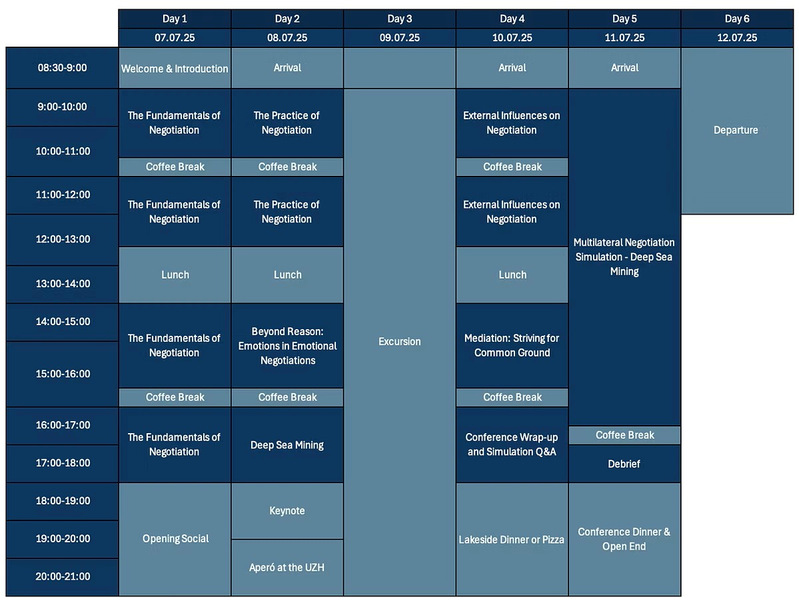 2025年7月6日抵达苏黎世大学,7日至12日参加全球谈判大会课程学习和模拟演练(初步日程见下表),其中7月9日赴日内瓦参访联合国机构,7月12日同联合国欧洲总部的中国籍青年项目官员及后备人才座谈。课程详情及主讲人介绍请参阅全球谈判研究院网站。具体行程与全球谈判研究院、苏黎世大学等共同设计确定。