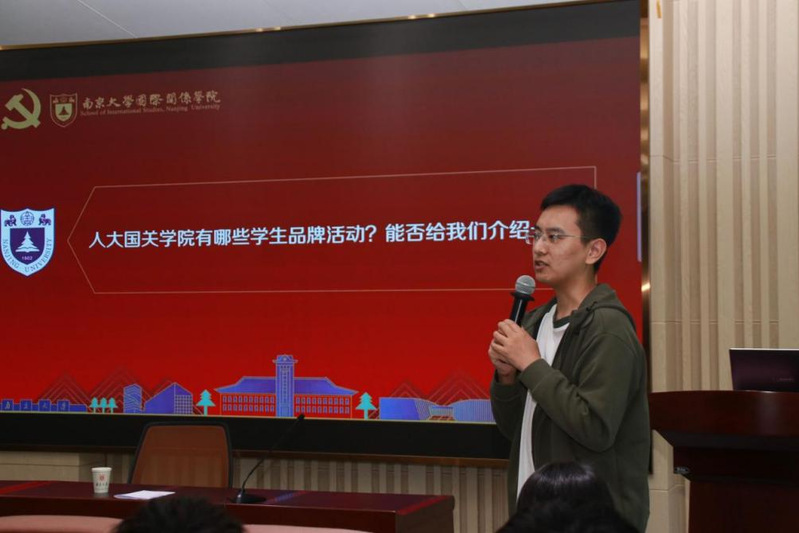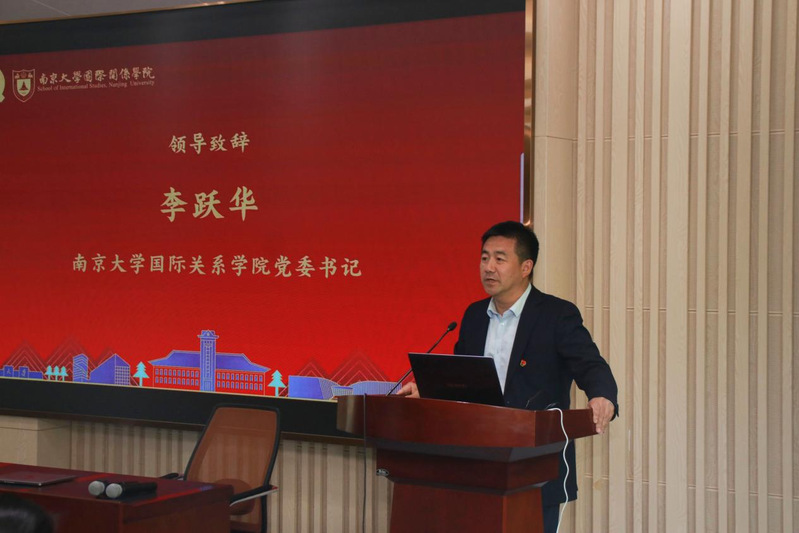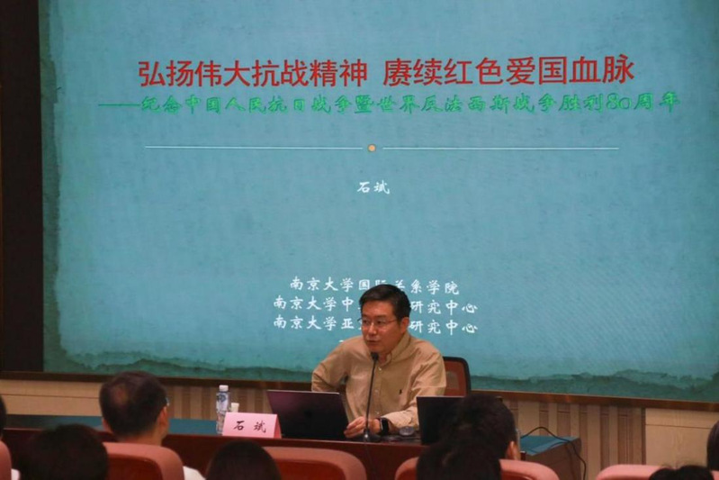 随后,石斌教授向与会师生以《弘扬伟大抗战精神,赓续红色爱国血脉》为题讲授主题党课。石老师首先强调了南京这座城市在中国历史上独特的地位。他从历史纵深角度阐述南京是华夏文明、华夏民族的福地与复兴之地。同时,他也论及近代南京历经磨难,却以其悲壮与坚韧展现出英雄城市风貌。石老师聚焦抗战主题,通过详实的数据与历史事实,展现了中国人民在十四年抗战中所作出的巨大牺牲与重大贡献。他深入剖析了抗战精神的内涵,将其概括为爱国情怀、民族气节、英雄气概、必胜信念以及共同体意识,强调这是中华民族不屈精神的象征,是新时代激励中华儿女战胜风险挑战、实现民族复兴的强大精神力量。石老师又结合当前国际形势,呼吁在座师生在如今复杂的周边安全环境下,需结合自身专业,认真思考如何弘扬抗战精神,践行爱国主义,夯实全民国家安全意识,肩负起国际问题研究者的历史责任与使命。石老师娓娓道来,语句精炼,引得在场师生深刻共鸣。