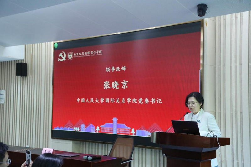 张晓京书记代表中国人民大学师生访问团队致辞。张书记道出了三个关键词。第一是“学术共同体”,两校两院学源深远、学脉交叠,你中有我、我中有你,共同培养出时殷弘老师、毛维准老师等众多优秀人才。第二是“回到现场”,今年恰逢世界反法西斯战争胜利80周年,中国人民抗日战争胜利80周年,联合国成立80周年;全民国家安全教育日设立10周年,国家安全法的颁布和实施10周年。在这样一个关键时代节点上,人大来访团选择了南京这座“历史现场”重镇,瞻仰了中山陵,悼念了侵华日军南京大屠杀遇难同胞,参观了渡江胜利纪念馆。第三是“共谋发展”,同兄弟院校通力合作,共同推动教学科研、人才培养的进步。张书记代表人大国关感谢南大国关的大力支持和热情接待。