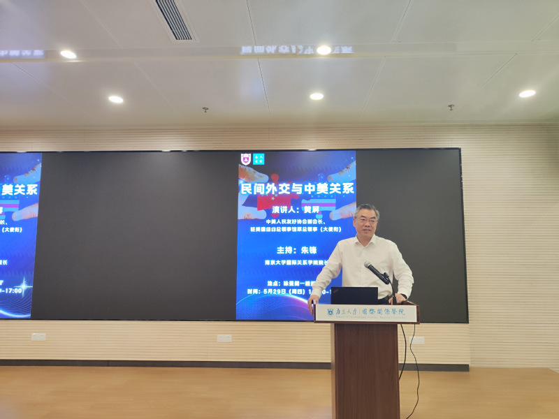 5月29日下午,太阳成城集团tyc234cc古天乐迎来一场精彩纷呈的讲座。中美人民友好协会副会长、驻美国纽约总领事馆原总领事(大使衔)黄屏大使,受邀为师生们带来了一场主题为 “民间外交与中美关系” 的深度分享。讲座由太阳成城集团tyc234cc古天乐经理朱锋教授主持。